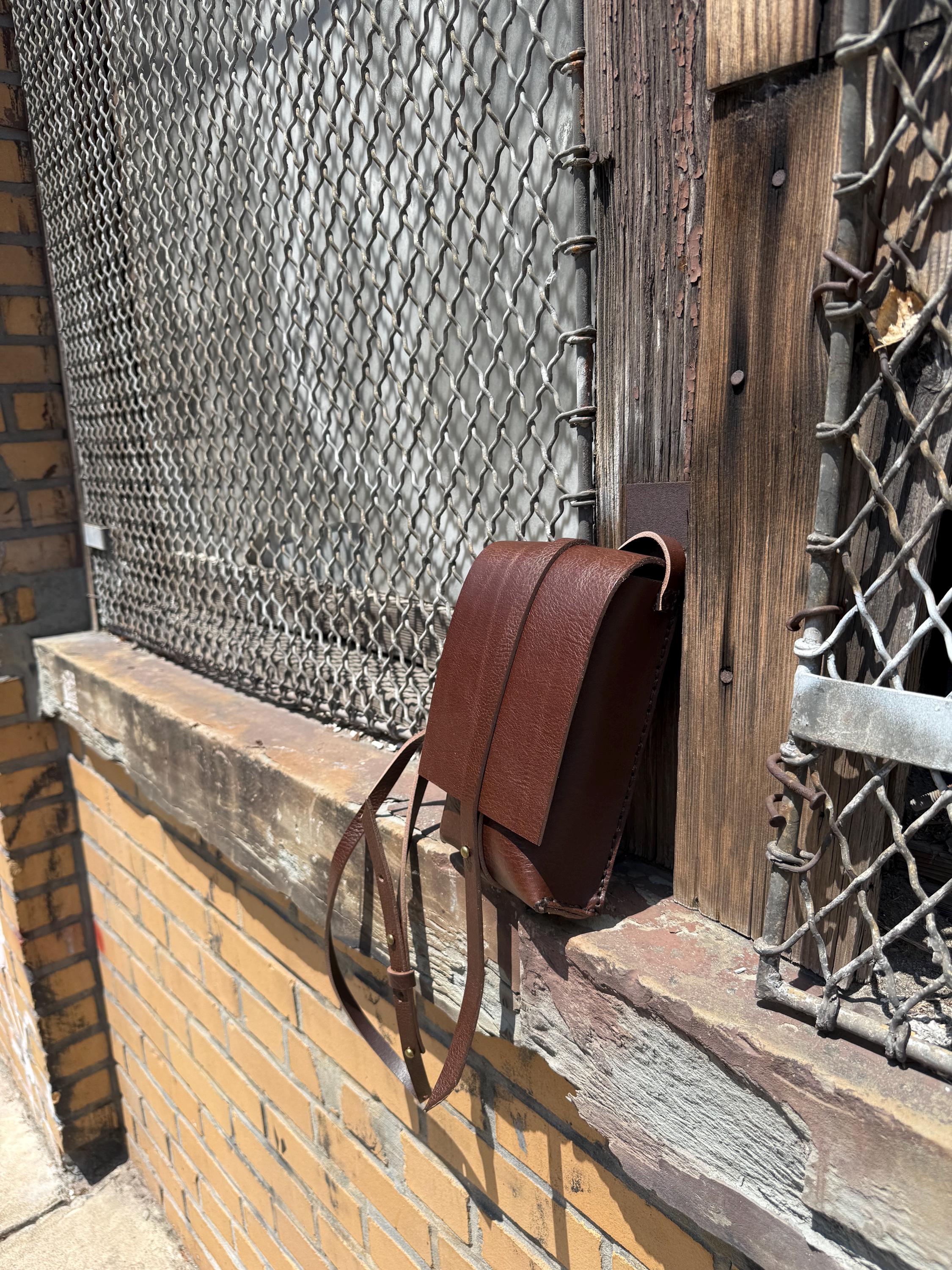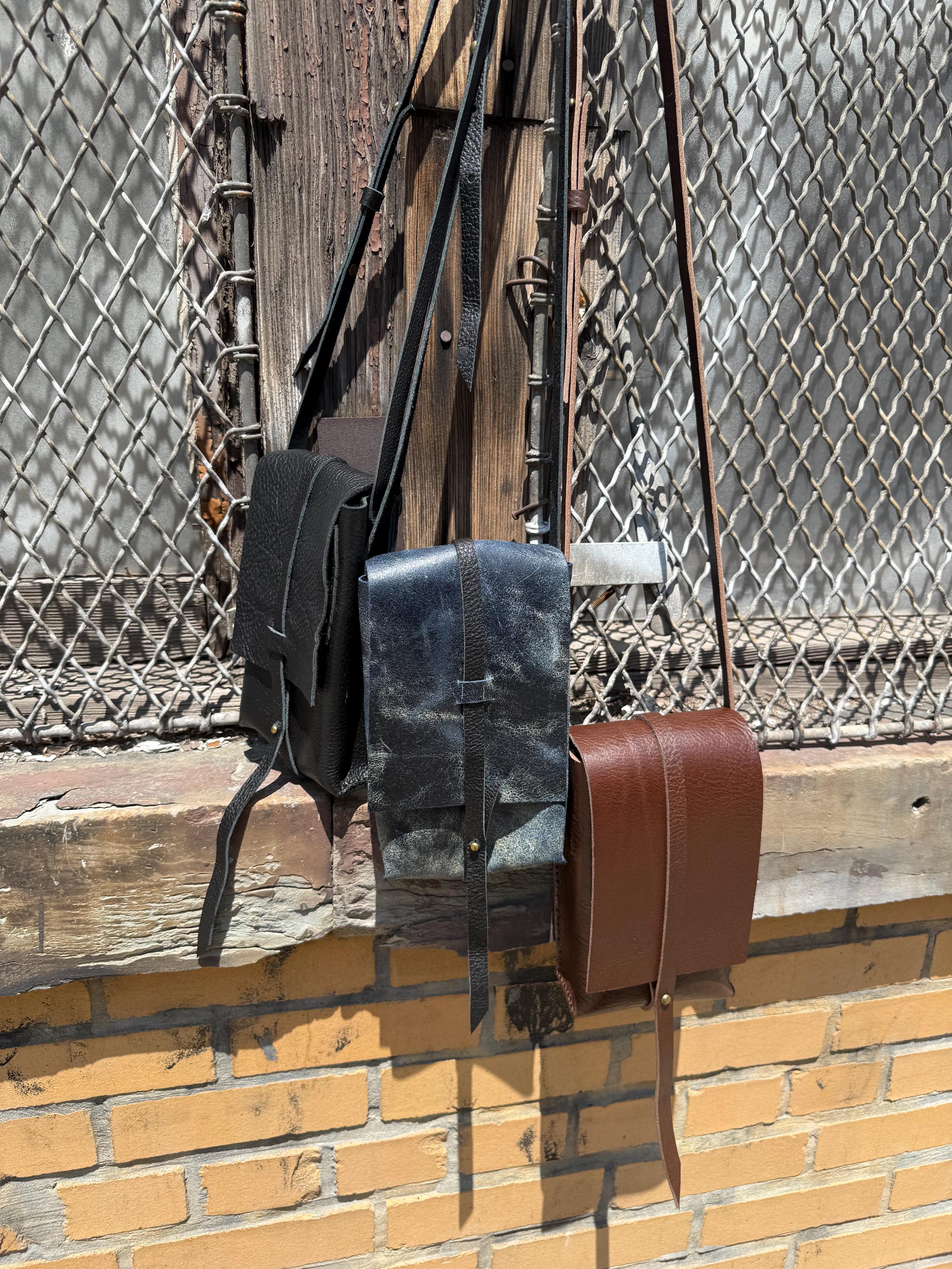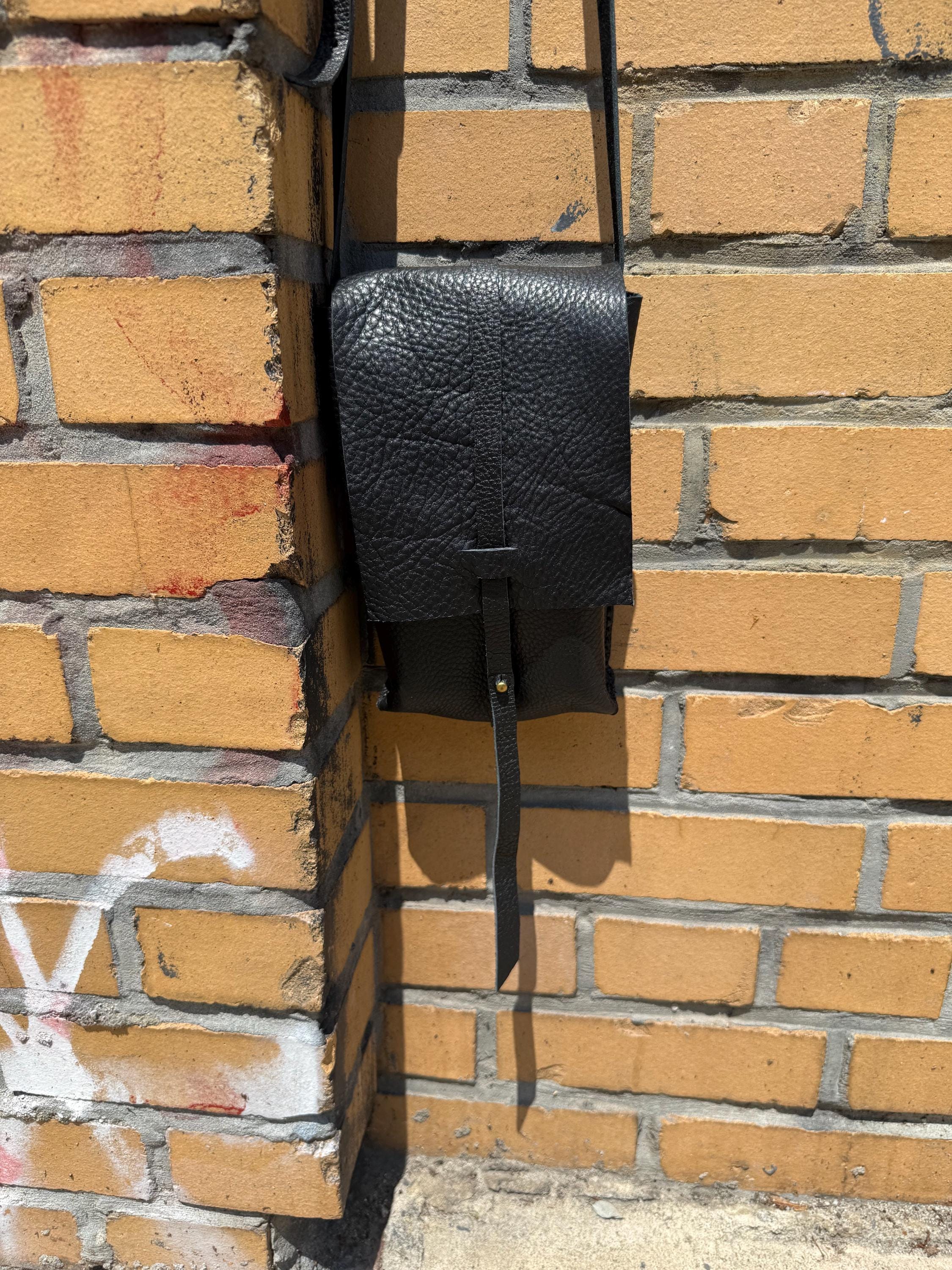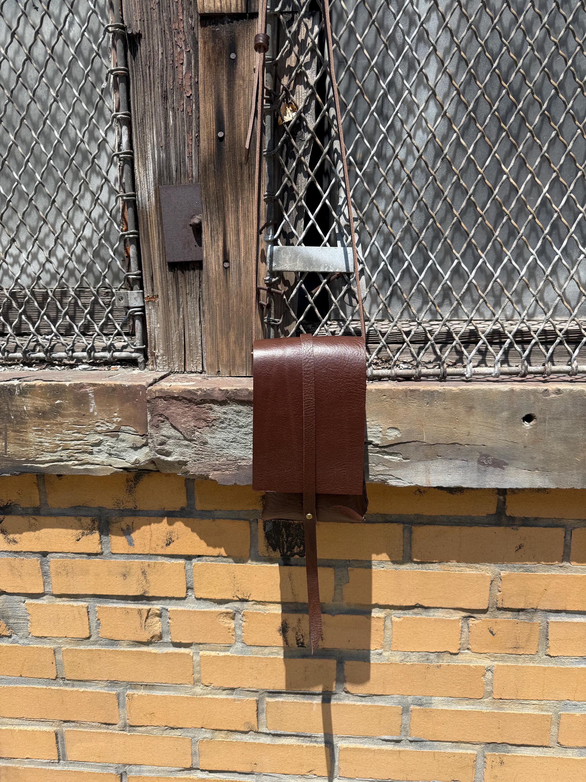 Handmade leather mini bag case for iPhone 17 plus. Bag features a pocket under flap, sleeve separator inside the bag, adjustable cross body strap, stud closure. Hand sewn in whatever leather you choose. and chocolate. Stud closure makes it easy in and out but can be made with many types of closures. As always all of our products are made from scratch without machines glues or lining 100% by humans hands. Made for you at the time of your order in NYC.